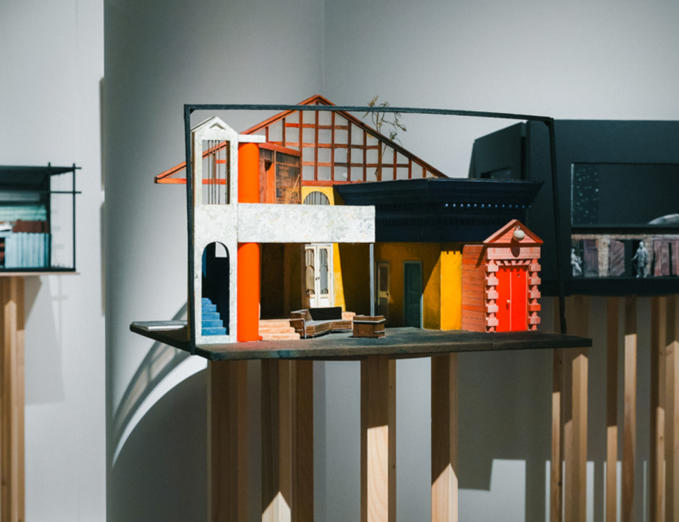 Архитектура выставки, разработанная сценографом Александром Боровским, напоминает фасад театра на Чистопрудном бульваре. Это словно театр, открывший свои двери и приглашающий зрителей в мир за кулисами.
