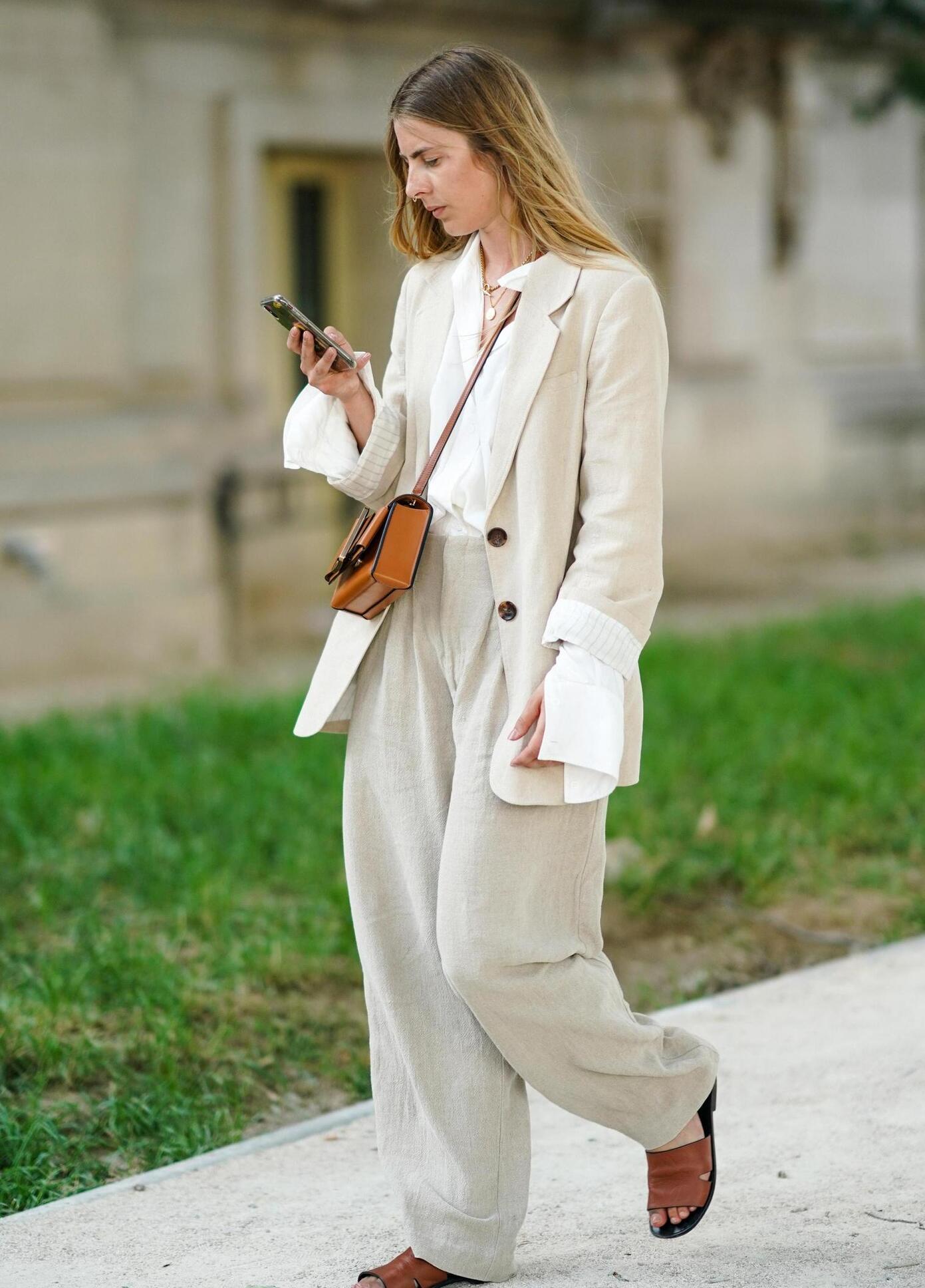 Этот образ - настоящий ультрамодный офисный стиль, который в 2024 году покорил сердца женщин всех возрастов. Чтобы снизить градус серьезности, выберите юбку с разрезом или же акцентные туфли со змеиным принтом.